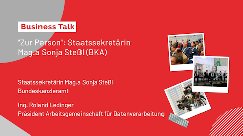 Business-Talk „Zur Person“: Staatssekretärin Mag.a Sonja Steßl (Bundeskanzleramt) im Gespräch mit Ing. Roland Ledinger (Präsident Arbeitsgemeinschaft für Datenverarbeitung). |